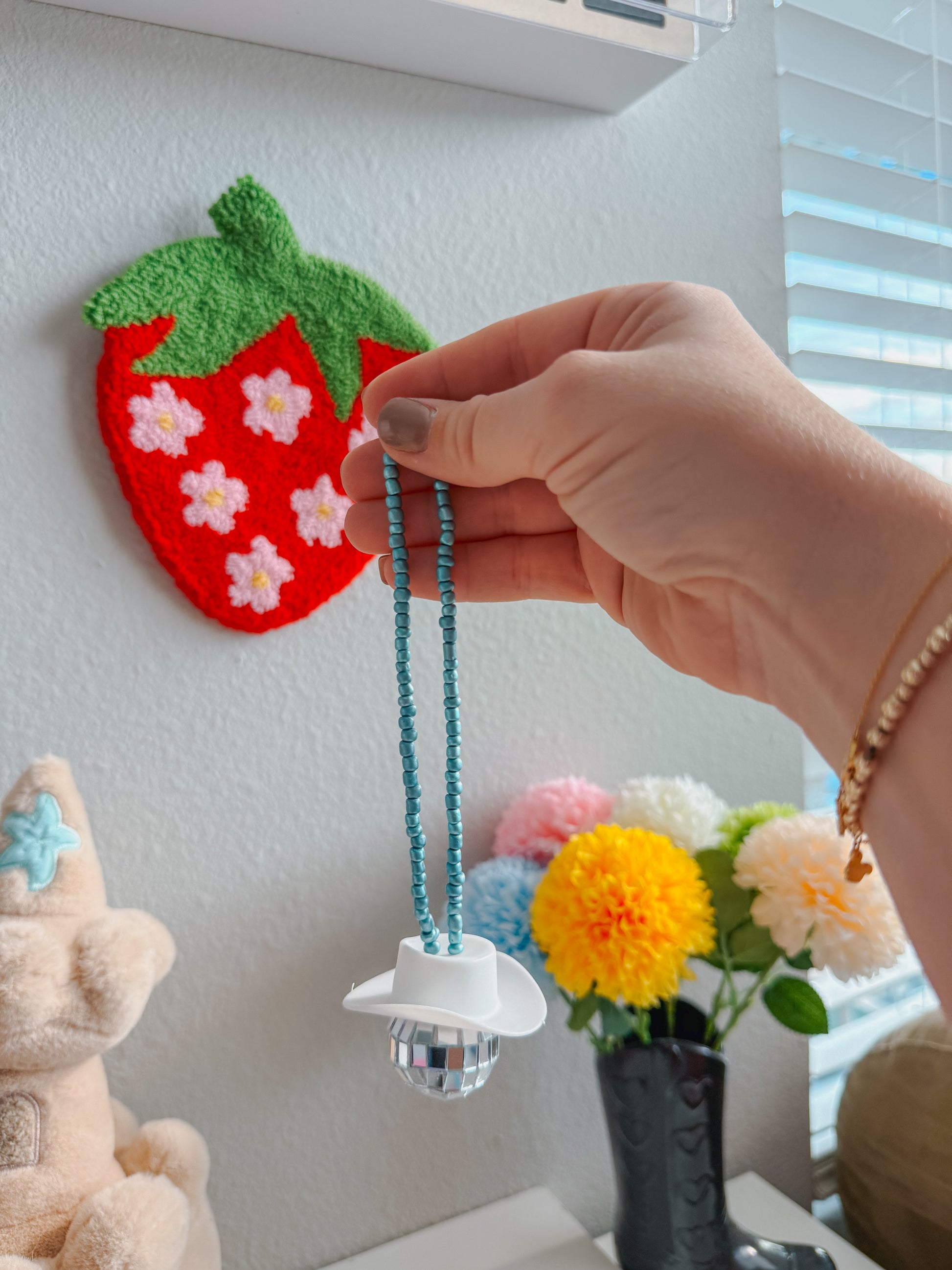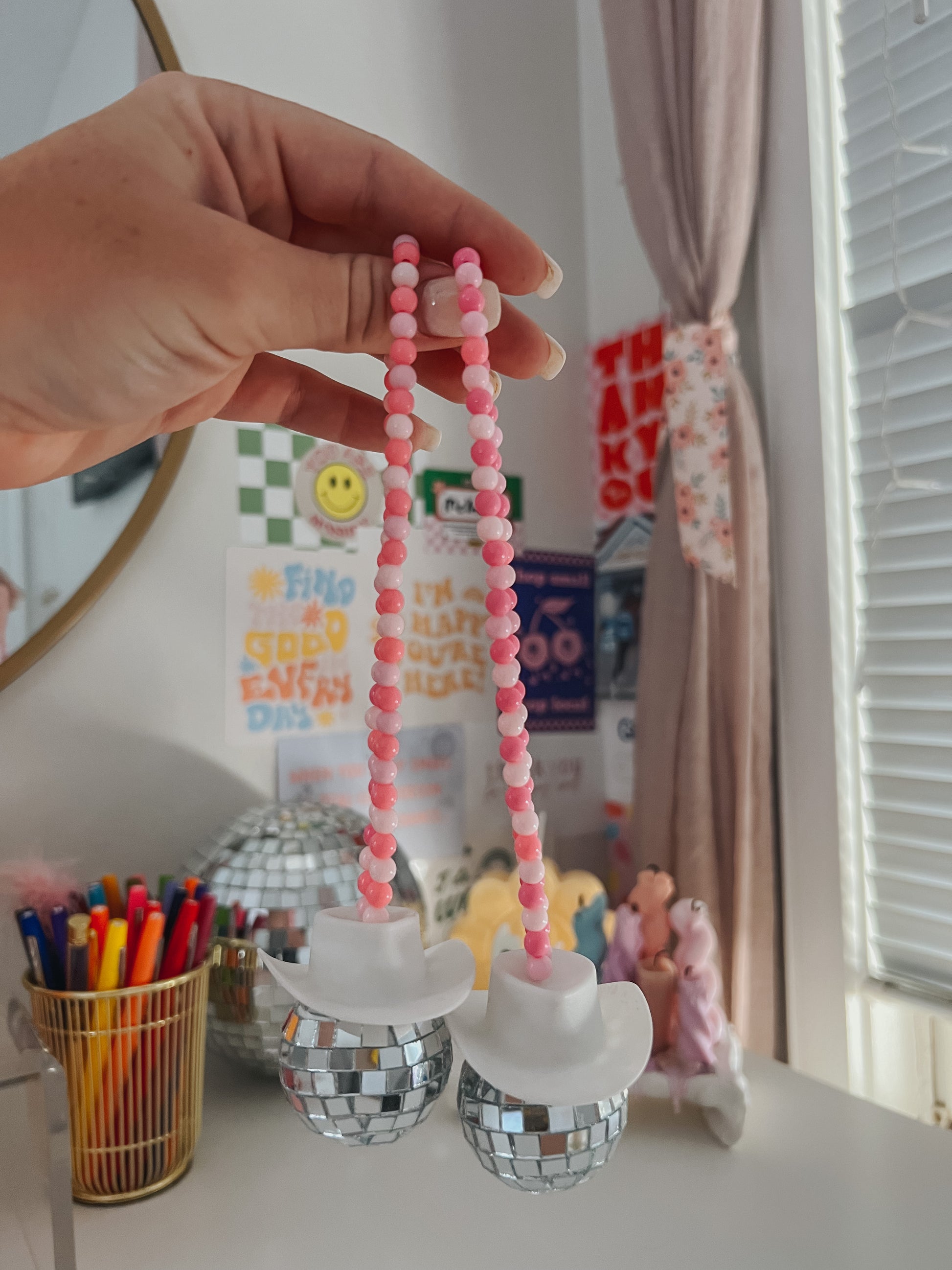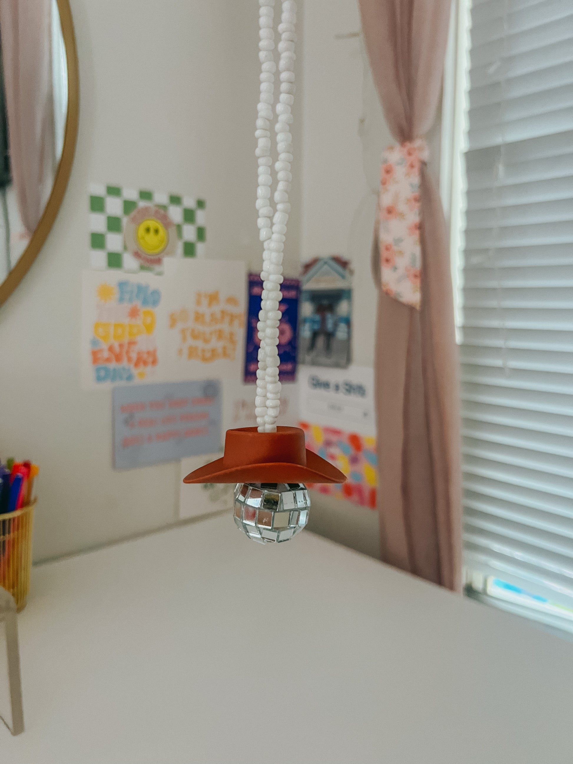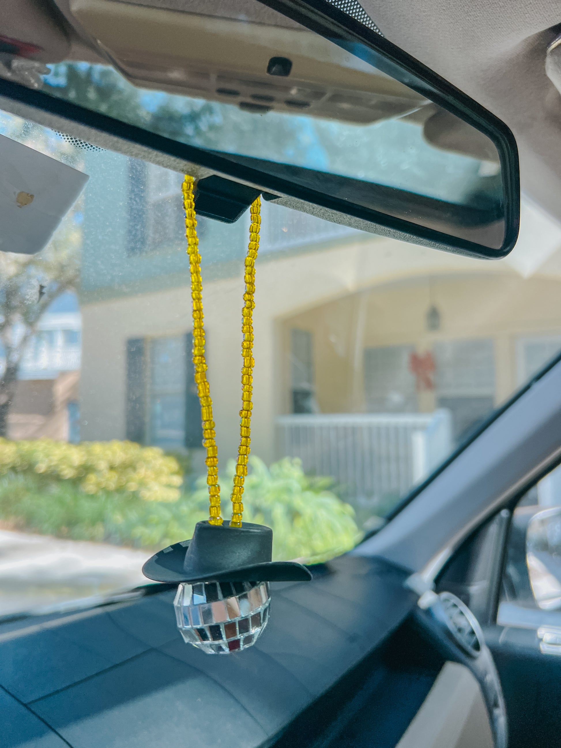 Turn your car into a party on wheels with this disco cowboy car hanging! Featuring a sparkly disco ball and a cool cowboy hat, this quirky car accessory is sure to turn heads and bring some fun on your next road trip. Yeehaw!