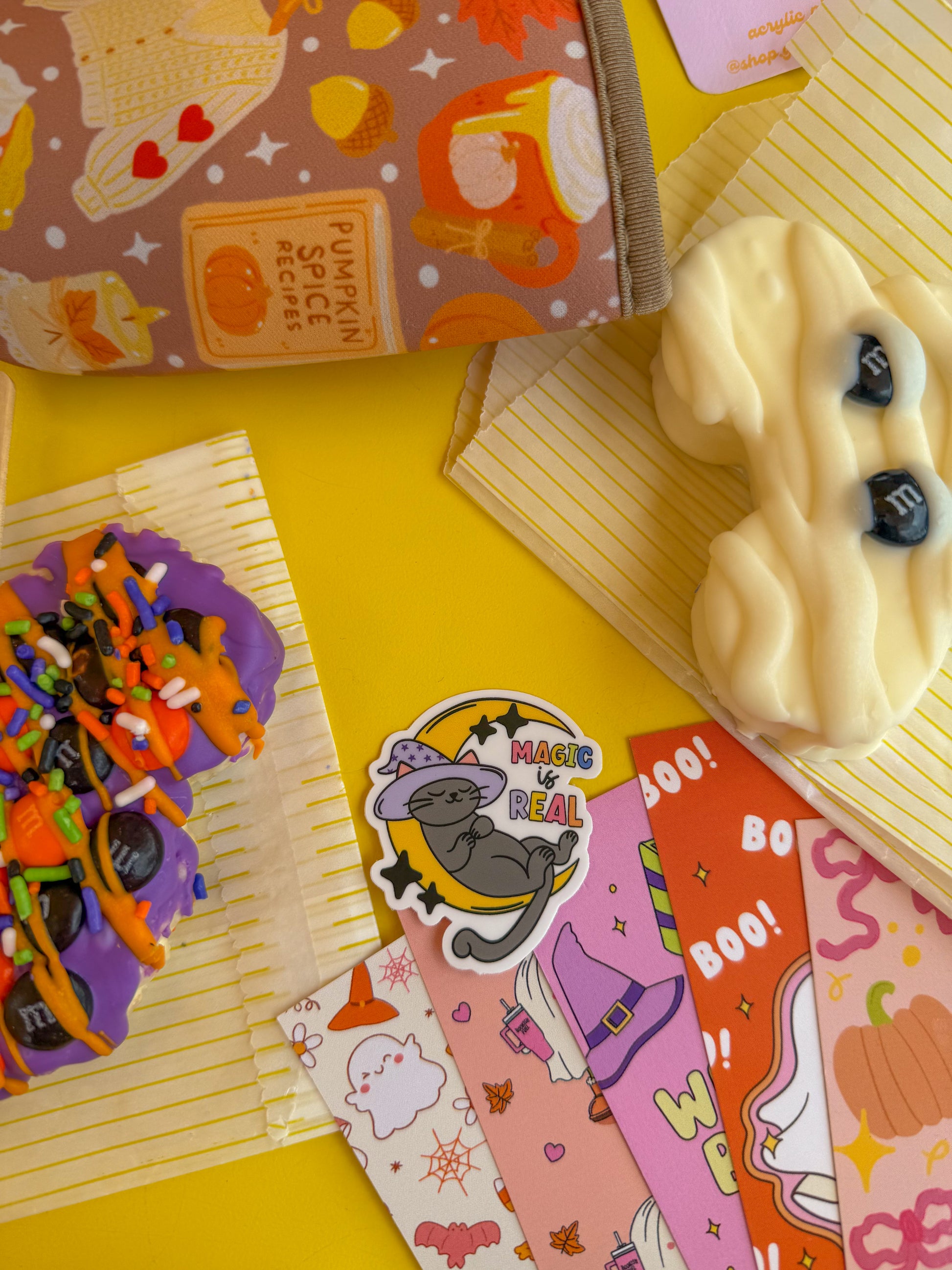 Bring a touch of whimsy to your world with the Magic Is Real sticker! Featuring a charming cat basking under a glowing moon, this playful design adds a spark of enchantment wherever you stick it. Perfect for dreamers who believe in a little magic every day.
